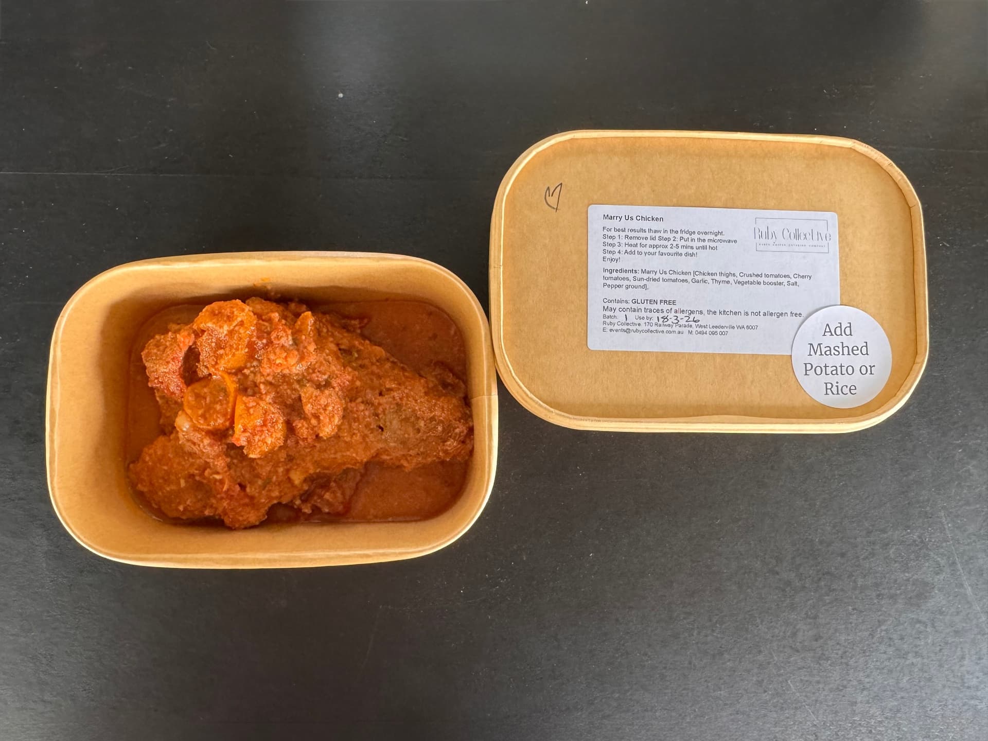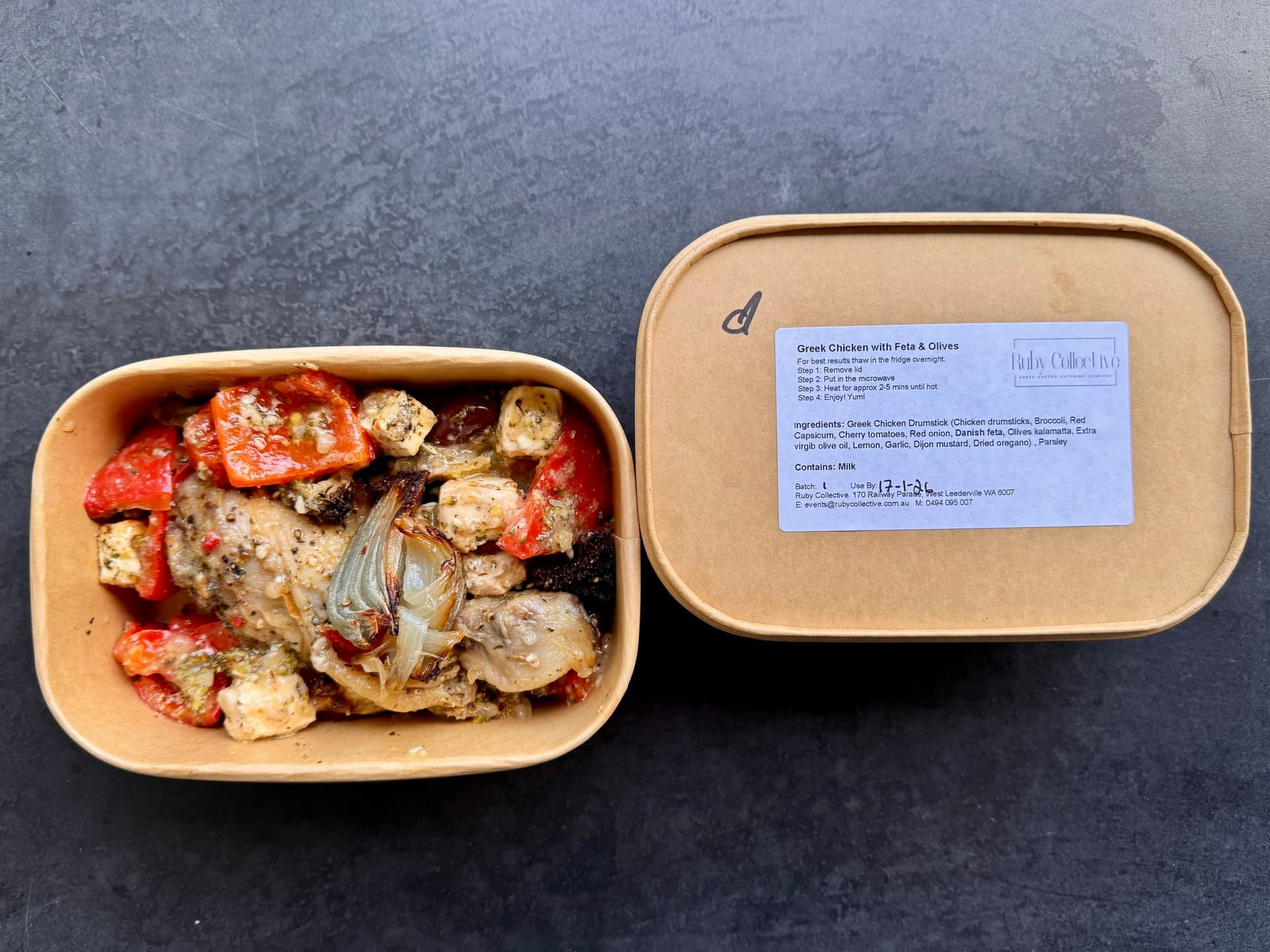Garlic, lemon & herb-marinated chicken drumsticks, oven-roasted alongside broccoli, capsicum, cherry tomatoes, and red onion. A vibrant, flavour-packed dish that brings the taste of the Mediterranean to your table — fresh, wholesome, and downright delicious. 2 drumsticks