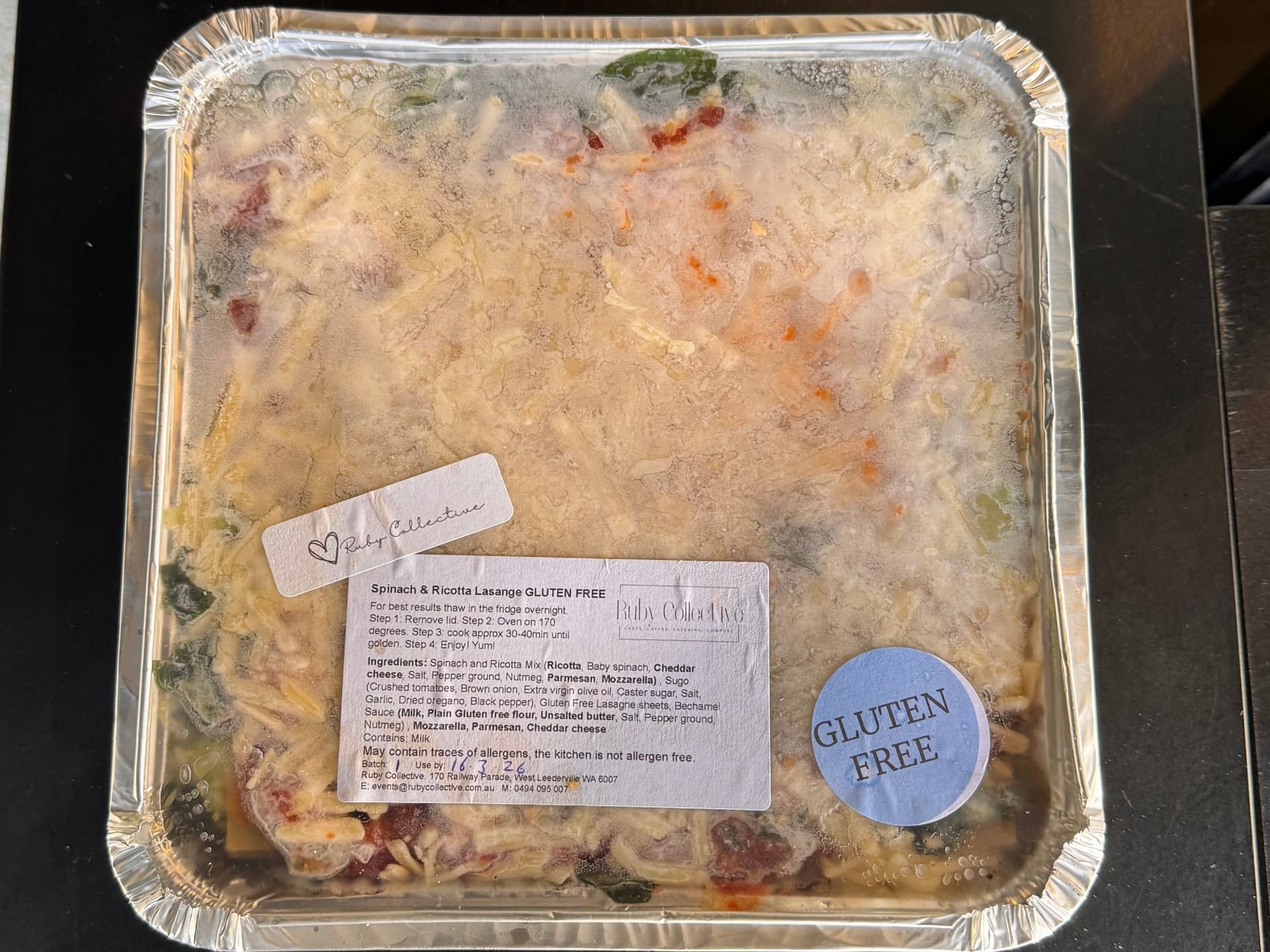 Gluten Free Lasagne sheets layered with ricotta, spinach and sugo sauce, finished with cheddar, mozzarella and parmesan.