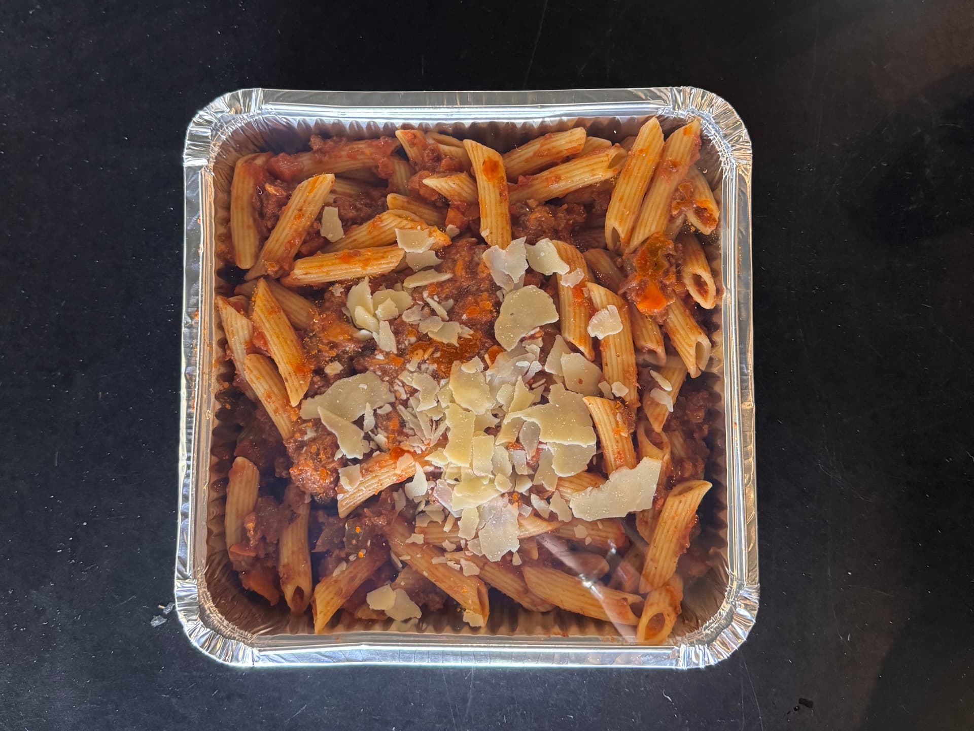 Penne with slow-cooked Bolognese, parmesan and fresh herbs.