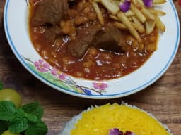 A traditional Persian split pea stew served with a side of fluffy saffron rice. Each spoonful is a blend of tender peas, aromatic spices, and the warmth like a home-cooked meal. Enjoy the simplicity and richness of this classic dish, now available for you to savor at home.