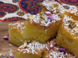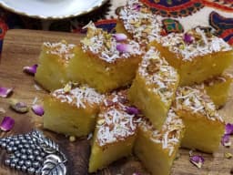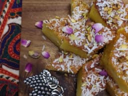 Flour (Wheat), Sugar, Yoghurt (Milk), Eggs, Vegetable oil, Garnish(Desiccated Coconut, Ground Pistachios, Cardamom, Dried Rose Petals), Rose water, Baking powder, Cardamom, Saffron infusion
