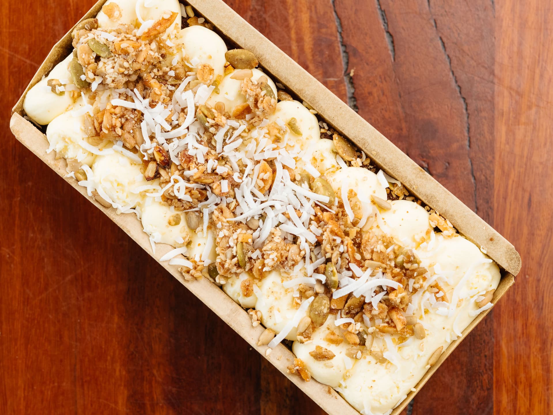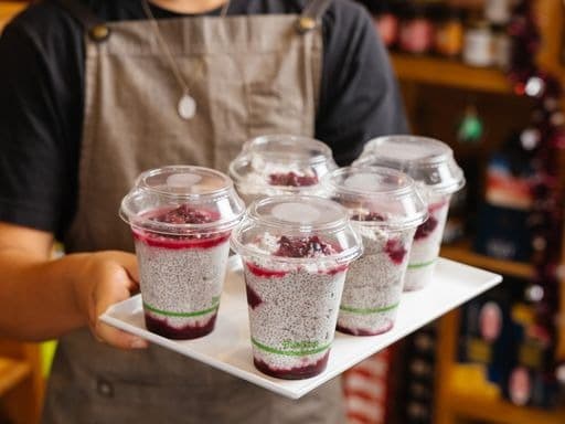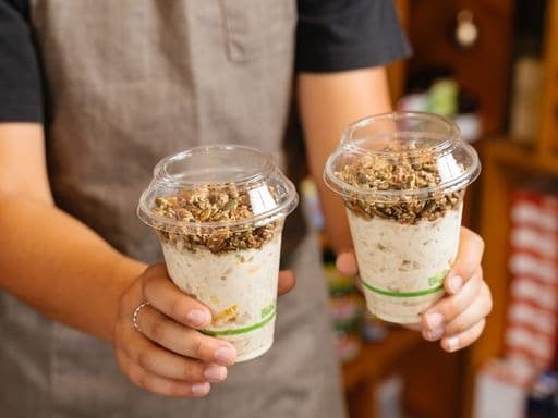 Are a delicious and healthy breakfast item or snack. Made with coconut milk and cream, maple syrup and topped with our house made compote.