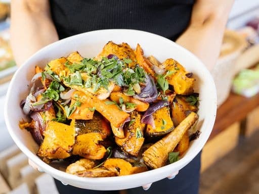 This vibrant and nourishing salad combines the earthy flavors of roasted carrots and cauliflower with the warmth of harissa and a touch of sweetness from honey. Served on a base of wholesome brown rice and protein-rich chickpeas. The addition of toasted almonds, sweet raisins, crunchy pepitas, fresh coriander, and spinach brings a mix of crunch and freshness to every bite. The harissa and honey dressing ties everything together with a perfect balance of heat and sweetness, creating a delightful flavor explosion. This dish is not only vegetarian but also dairy-free and gluten-free, making it suitable for a wide range of dietary needs. Please note it contains onion and garlic for extra depth of flavor.