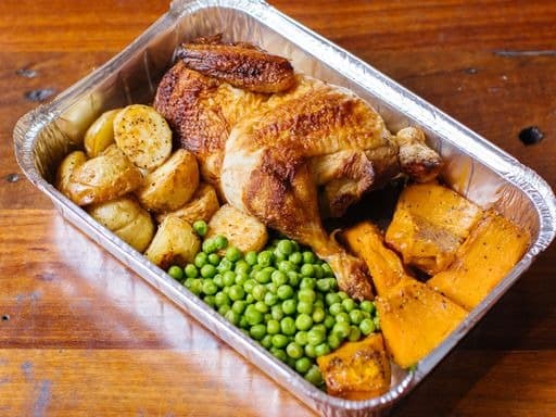 Our succulent roast chicken takes center stage, cooked to golden perfection with a crispy and flavorful skin. Each bite reveals tender and juicy meat, seasoned to perfection, ensuring a burst of savory goodness in every mouthful. Our Roast Chicken Dinner comes with golden potatoes, sweet peas, tender roasted pumpkin, and gravy