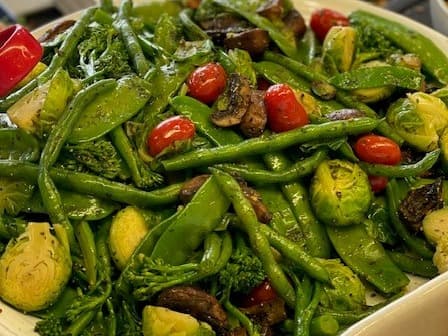 Blanched beans, snow peas, broccoli and Brussel sprouts and a tangy herbaceous dressing made with salsa Verde. Topped with mushrooms and oven roasted cherry tomatoes.