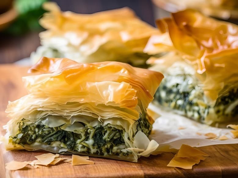 Spanakopita is a traditional Greek savory pastry that consists of spinach and ricotta cheese, leek nutmeg and leek filling wrapped in layers of crispy phyllo pastry.