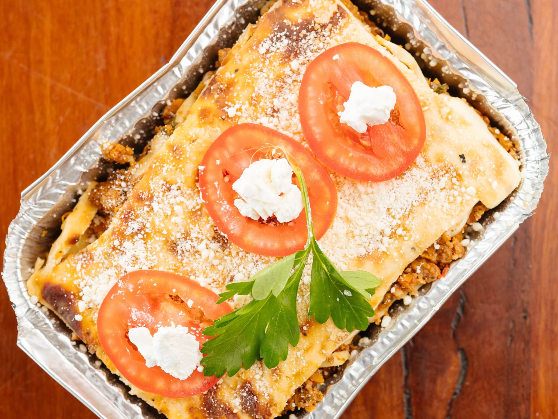 Our lasagne consists of layers of pasta, hearty beef ragu sauce with a creamy bechamel on top.