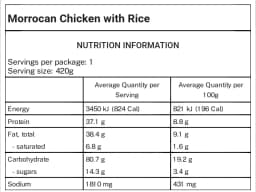 Basmati rice, Chicken tenderloin, Moroccan spice, Pears, Onion, Water, Tomatoes, Lemon juice, Vegetable Oil (Canola Oil, Sunflower Oil) (Soy), Edamame beans (Soy), Roasted red capsicum, White onion, Corn, White vinegar, Lemon pepper, Salt, Sugar, Rice flour, Lemon granules, Garlic, Lemon flavour, Natural flavour, Lemon oil, Turmeric, Paprika powder, Coconut Yoghurt [Water, Organic coconut cream, Live cultures, Probiotics]