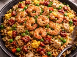Savour our Prawns Fried Rice. A delicious blend of tender prawns, fluffy basmati rice, and vegetables. Seasoned with nam jin sauce, sesame oil, and soy, it's an easy, flavourful meal ready when you are.