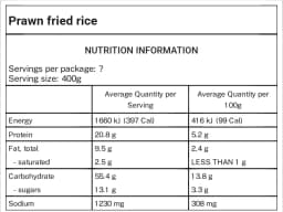 Nam Jin Sauce [Chillies, Garlic, Ginger, Coriander, Sugar, Salt, Lemon juice, Tamarind, Roasted red capsicum, Roasted red onion, Sweet soy sauce, Coconut sugar, Spring onion, Shallots, Sesame oil, Soy sauce (GF), Chicken, Vegeta, Liquid smoke, Bacon, White pepper powder], Basmati rice, Prawns (Crustacean), Mix Vegetables [Carrots, Broccoli, Green beans, Peas, Sweet Corn]