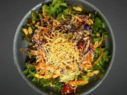 A vibrant vegan Thai salad bursting with fresh lettuce, tomatoes, carrots, and rice noodles. Topped with crispy fried noodles, Thai sauce, peanuts, and dukkah for authentic flavour and satisfying crunch. Simple, wholesome, and delicious.
