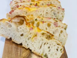 Soft, airy, Italian Sourdough Focaccia baked to perfection, topped with bacon and melted cheese.
