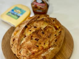 The Maple Bacon & Gouda Cheese Sourdough Loaf is a delightful fusion of savory flavours that elevates traditional sourdough bread to new heights. With the smokey & sweet aroma of bacon caramelised in maple and chunks of creamy gouda cheese throughout, each bite promises a harmonious blend of taste sensations. Perfect toasted, on its own or as the ultimate sandwich or toastie.