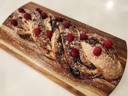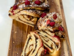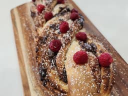 This Raspberry Gingersnap Sourdough Twist tastes as good as it looks. Such a beautiful festive center piece to any entertaining table or just as a treat for the family. Inside this lightly sweetened sourdough is a layer of raspberry jam then sprinkled with crushed gingernut biscuits, cinnamon & ginger and dark chocolate chips and finished with a dusting of icing sugar. Enjoy as is or top with fresh raspberries (as pictured), lathering of butter or some good quality raspberry compote or jam.