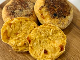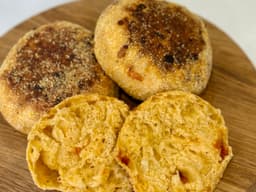 These sourdough sundried tomato & cheese English muffins are perfectly delicious toasted or used as a weekend breakfast burger. For an authentic touch split them open with a fork to expose their beautiful craggy holes. Best served toasted with a thick pat of butter or lemon curd to melt into delicious golden pools. If you like them crunchy on the outside and soft in the middle, then heat them up whole in a hot oven. Top with butter, fresh tomato, smashed avocado & crumbled feta for that perfect healthy snack or make into a breakie burger - so good!