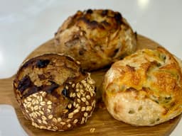 This Gift Box contains 3 Mini Sourdough Breads each approx 325-360gm perfect size to sample a variety of flavours without committing to buying a whole loaf, are a perfect size accompanying a charcuterie board or simply gift to someone deserving & special in your life.