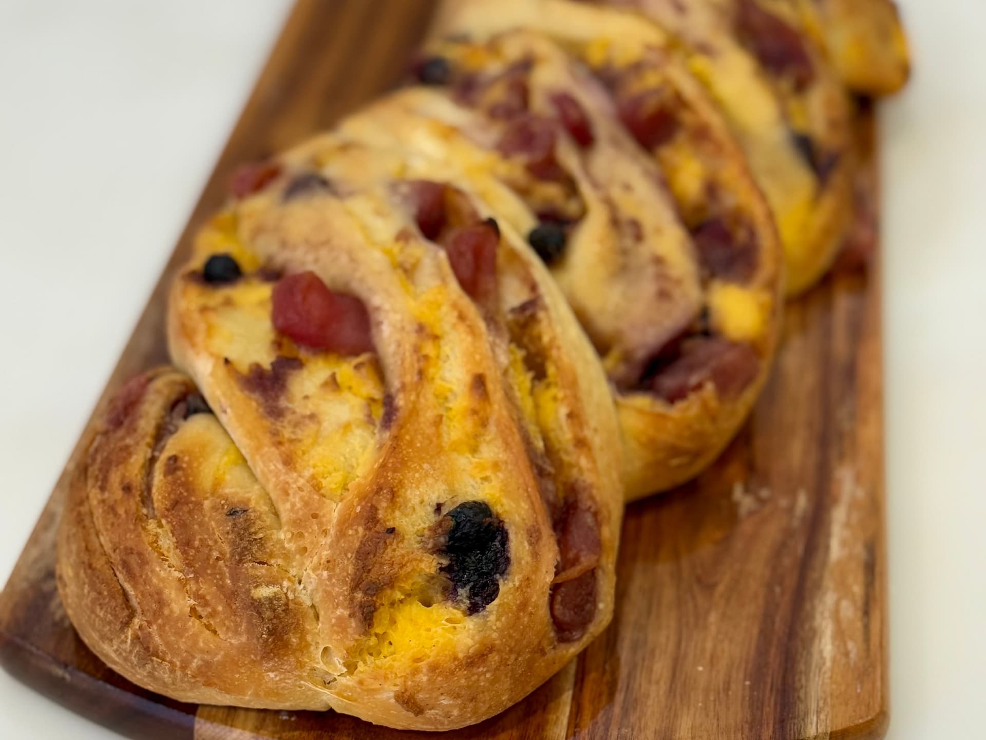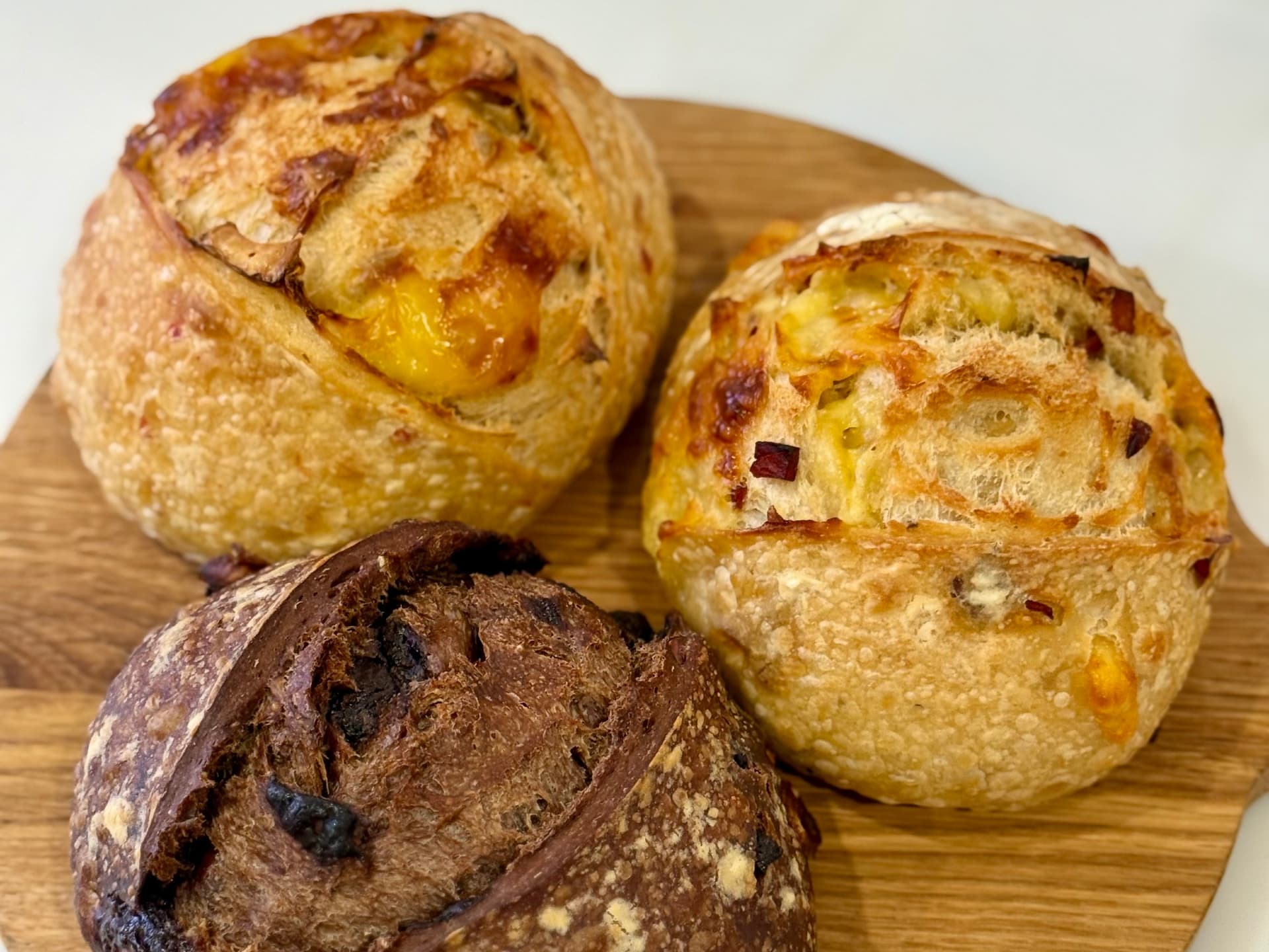 A bold sourdough infused with fiery chili, and the sweetness of chili honey and perfectly balanced with bursts of creamy brie cheese. This loaf pairs beautifully as part of a charcuterie board with cheeses and cured meats or try it with butter and an extra drizzle of honey. It's the kind of loaf that turns heads when you slice it open.