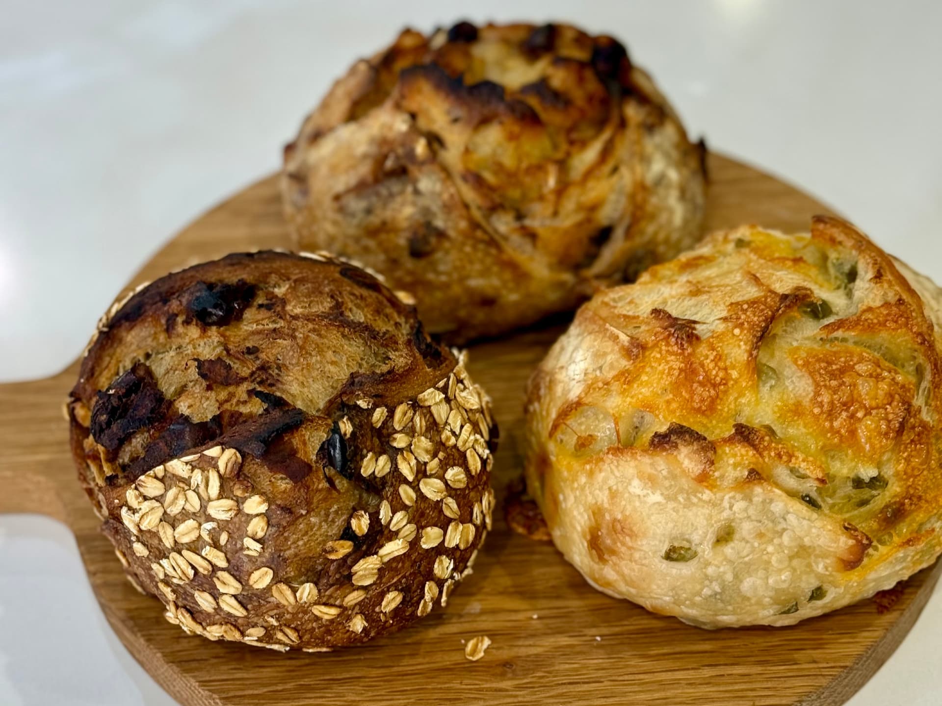 A flavourful twist on traditional sourdough. This loaf is infused with spicy pickled jalapeños and cheddar cheese. Ideal for paring with soups, accompanying a cheese & meat platter, toasted sandwich or just lathered in butter and eaten fresh.