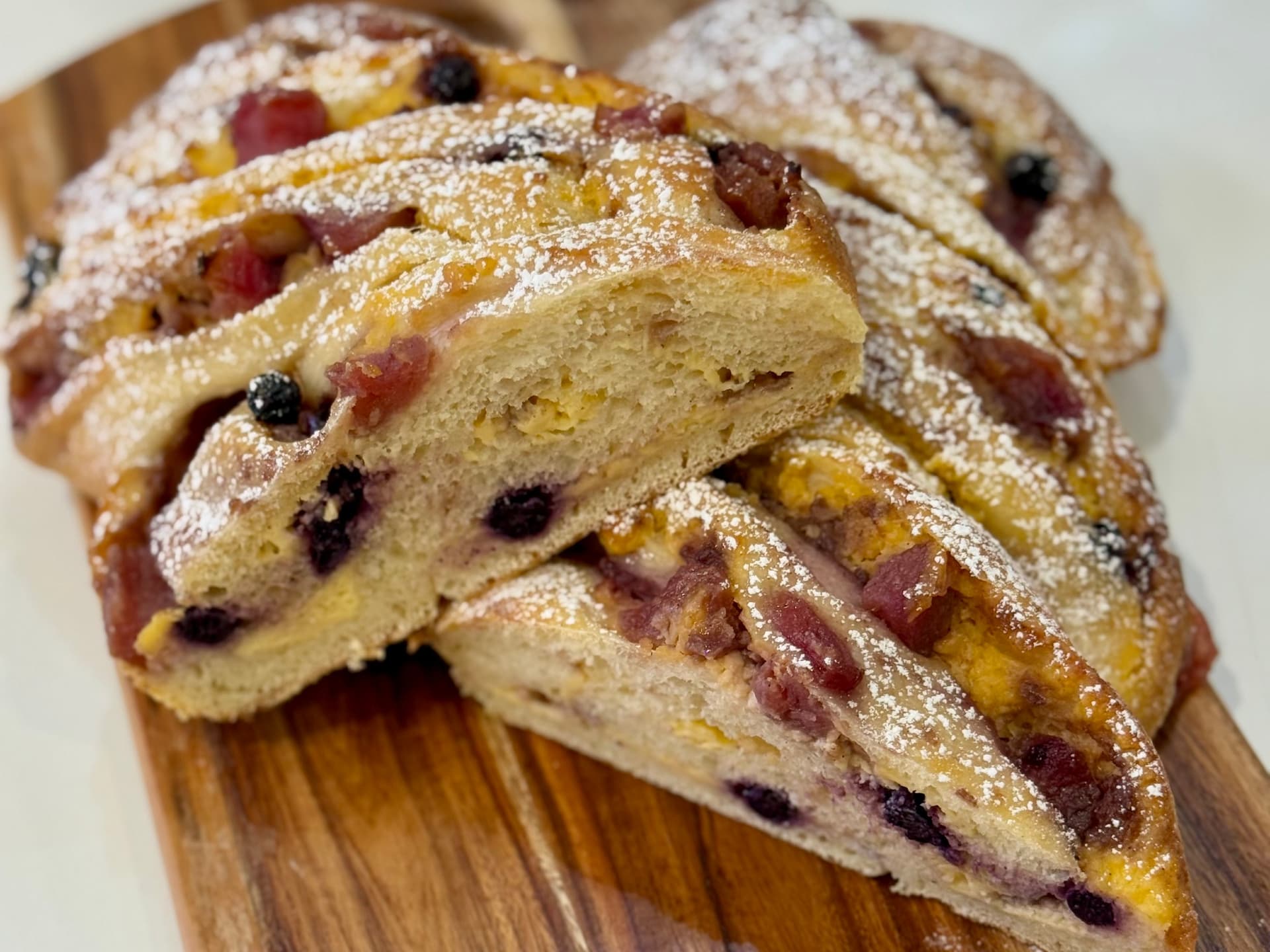 This focaccia is loaded with blueberries, has a hint of lemon zest throughout and dollops of lemon curd dimpled into the dough. After it is baked it is drizzled all over in a lemon cream cheese icing. This focaccia is naturally leavened, its light and airy and sweet and delicious. Available in 2 sizes.