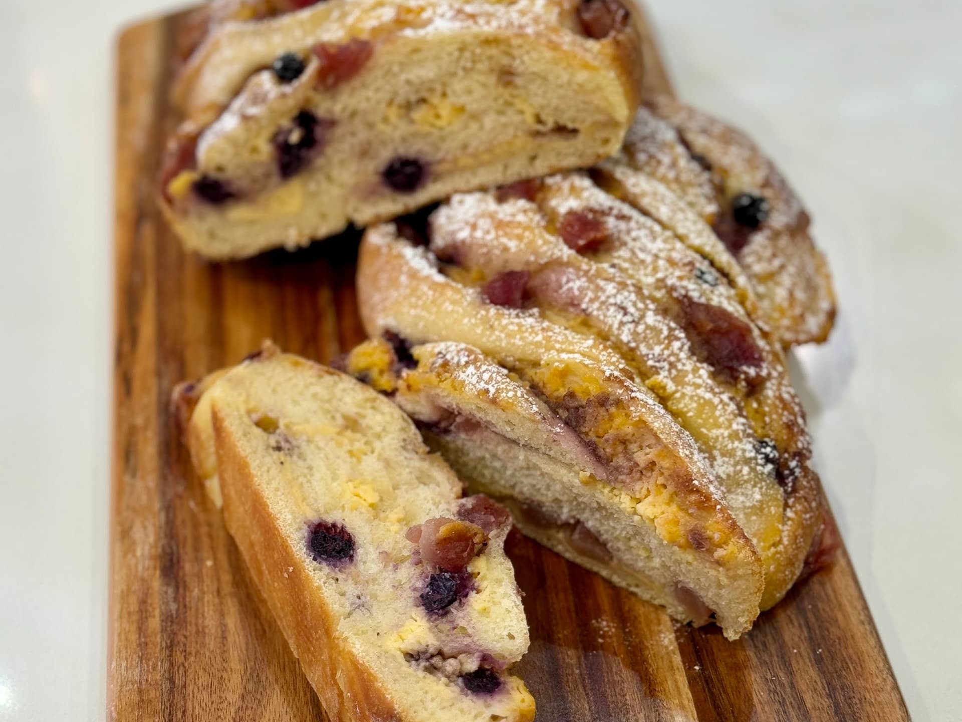Slough fermented sourdough is generously layered with a rich house-made apple and blueberry mix and homemade custard throughout and finished with a dusting of icing sugar. Perfect for any morning or afternoon treat with a cuppa or a dessert enjoyed with the family.