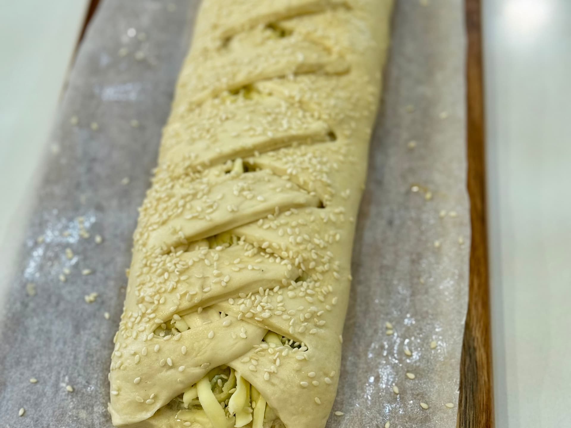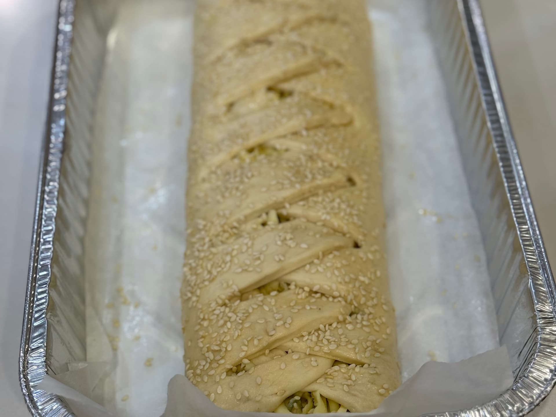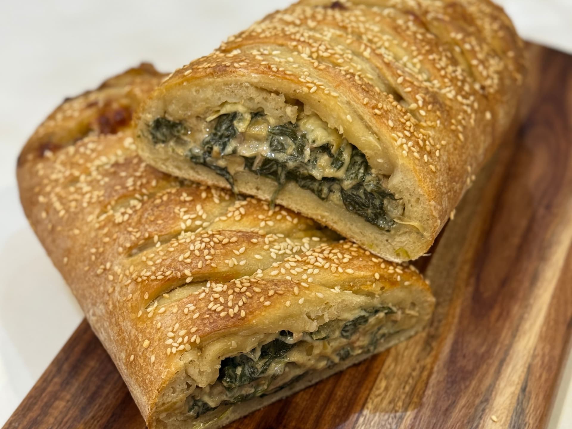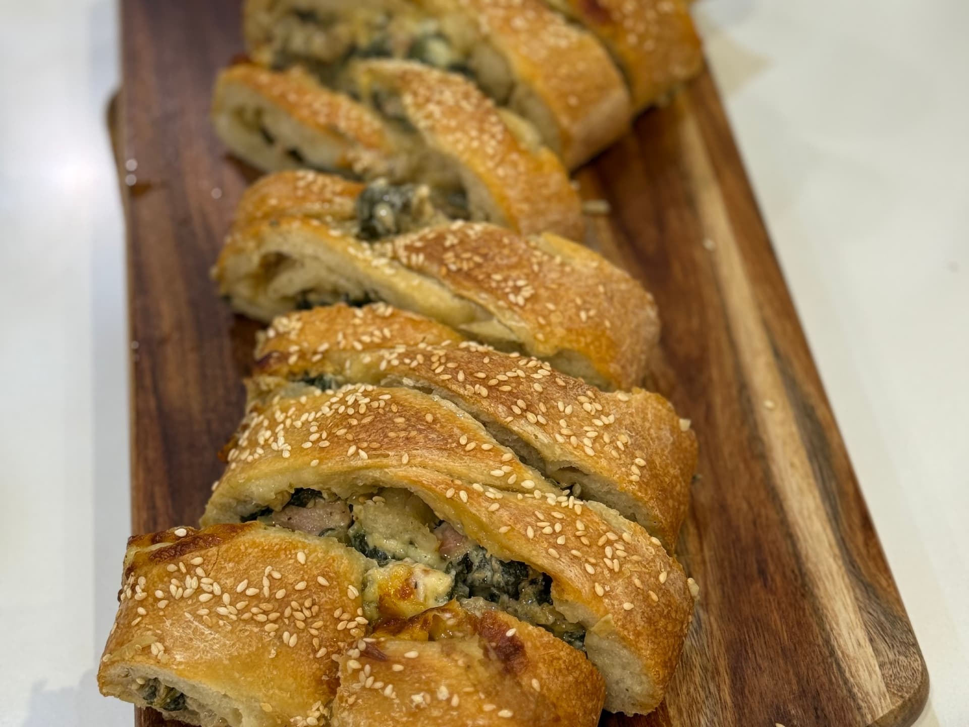 This is a true centerpiece loaf - designed to impress with both flavour and form. Best enjoyed freshly baked - this take-home loaf allows you to finish it in your own oven - filling your kitchen with irresistible aromas and delivering bakery fresh perfection every time. Our sourdough braid is generously stuffed with a rich creamy filling of sauteed onion and garlic, smokey bacon, marinated artichokes and spinach, all bound together in a creamy cheesy blend. Perfectly versatile, this stuffed sourdough braid loaf is equally suited to effortless entertaining or a comforting shared meal. Serve warm as a centerpiece for guests or enjoy as an indulgent night in dinner. Baking instructions come with loaf. Before baking: Leave out on benchtop covered for 60-75mins. Preheat oven at 220 C. Bake the loaf on center rack for 20-25mins, or until golden brown. Cool in tray for 10-15mins before cutting into slices or wedges. Serves approx 4-7 slices.