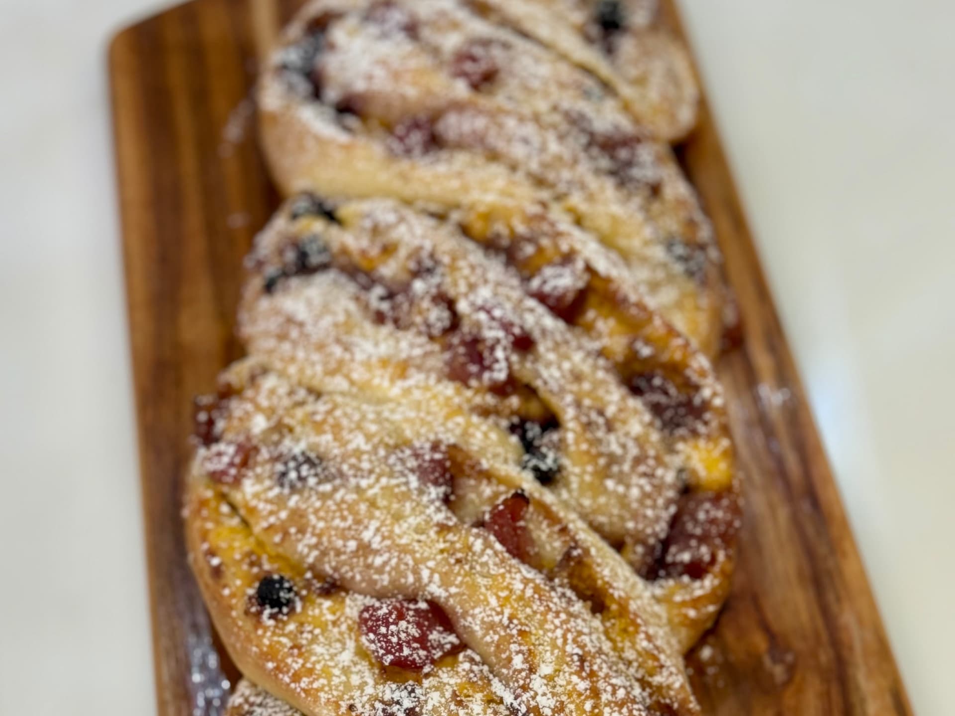 This Raspberry Gingersnap Sourdough Twist tastes as good as it looks. Such a beautiful festive center piece to any entertaining table or just as a treat for the family. Inside this lightly sweetened sourdough is a layer of raspberry jam then sprinkled with crushed gingernut biscuits, cinnamon & ginger and dark chocolate chips and finished with a dusting of icing sugar. Enjoy as is or top with fresh raspberries (as pictured), lathering of butter or some good quality raspberry compote or jam.