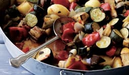 Briami is a traditional Greek vegan dish whereby vegetables are roasted to caramelised sweetness and served on a bed of couscous.
