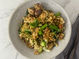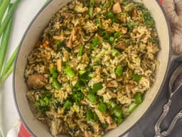 Water, Chicken thigh fillets, Rice, Carrots finely diced, Zucchini, Baby spinach leaves, Spring onion, Fish sauce, Kecap Manis (Wheat, Soy), Ginger, root, peeled, raw, Garlic, Fresh coriander, Chicken stock, White pepper