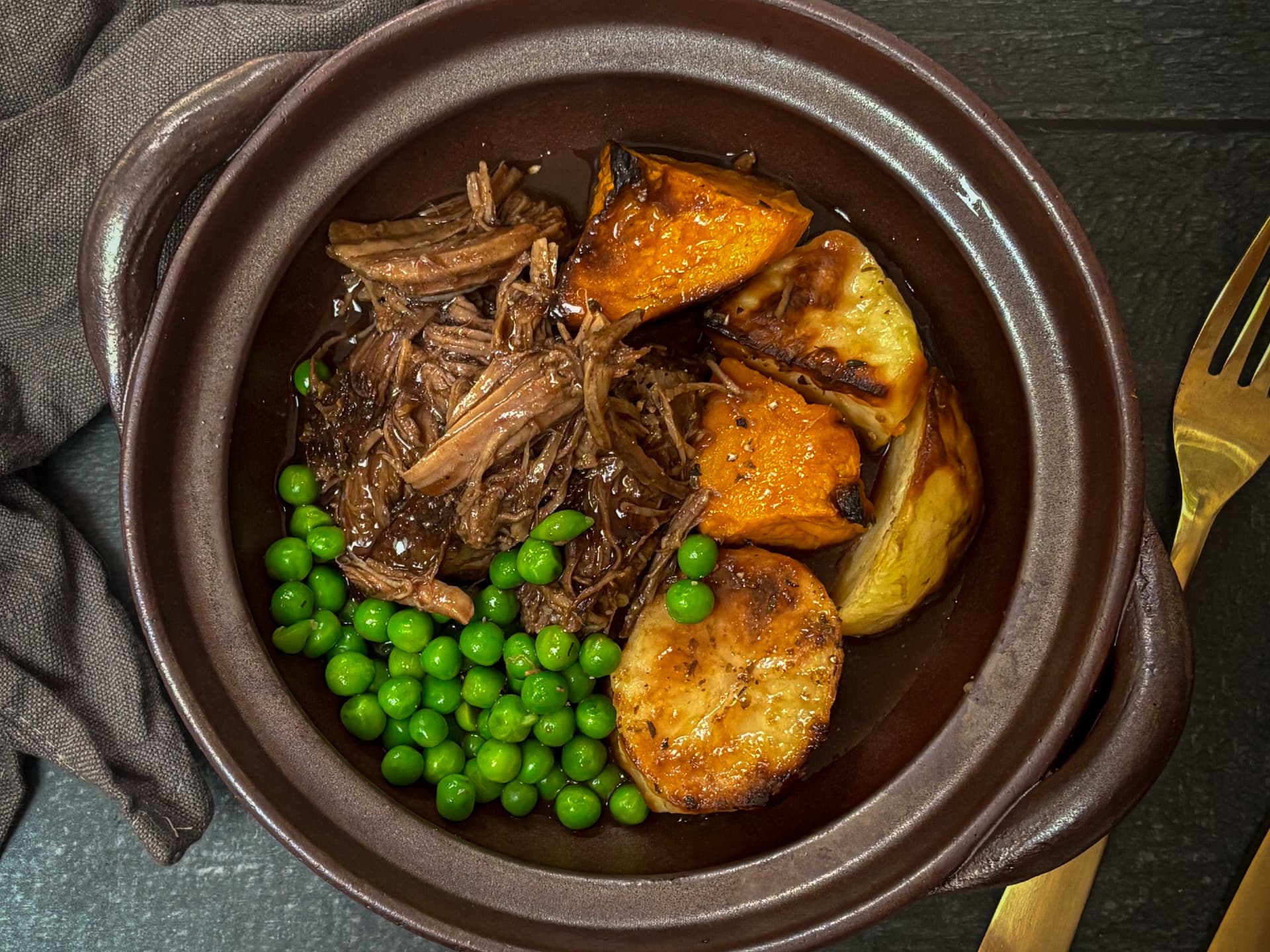 A dinner made with love and care, home style roast beef, roast vegetables, green peas and a rich red wine jus……dinner is served.