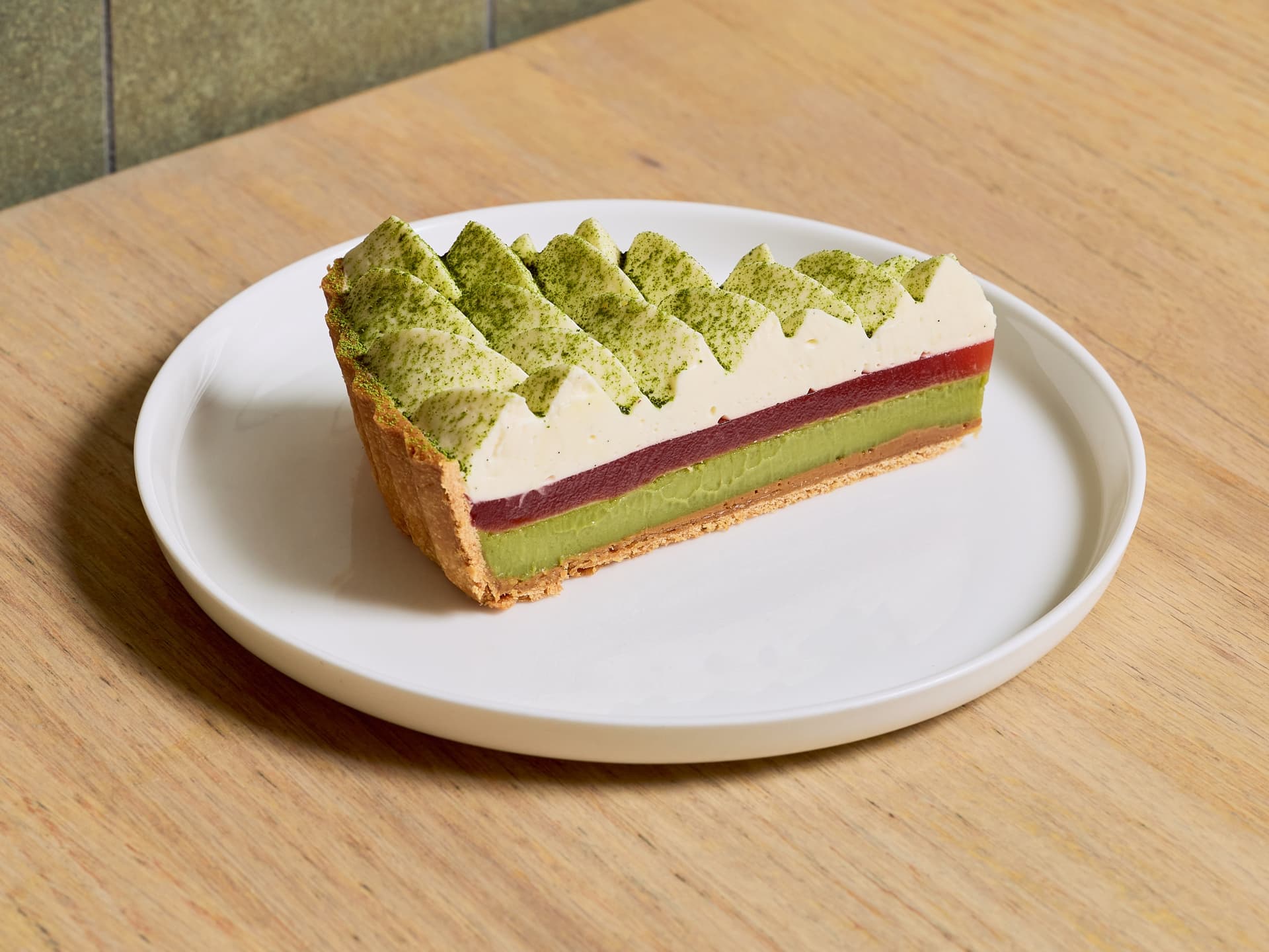 Matcha custard baked in shortcrust pastry, strawberry glaze and toasted rice cream.