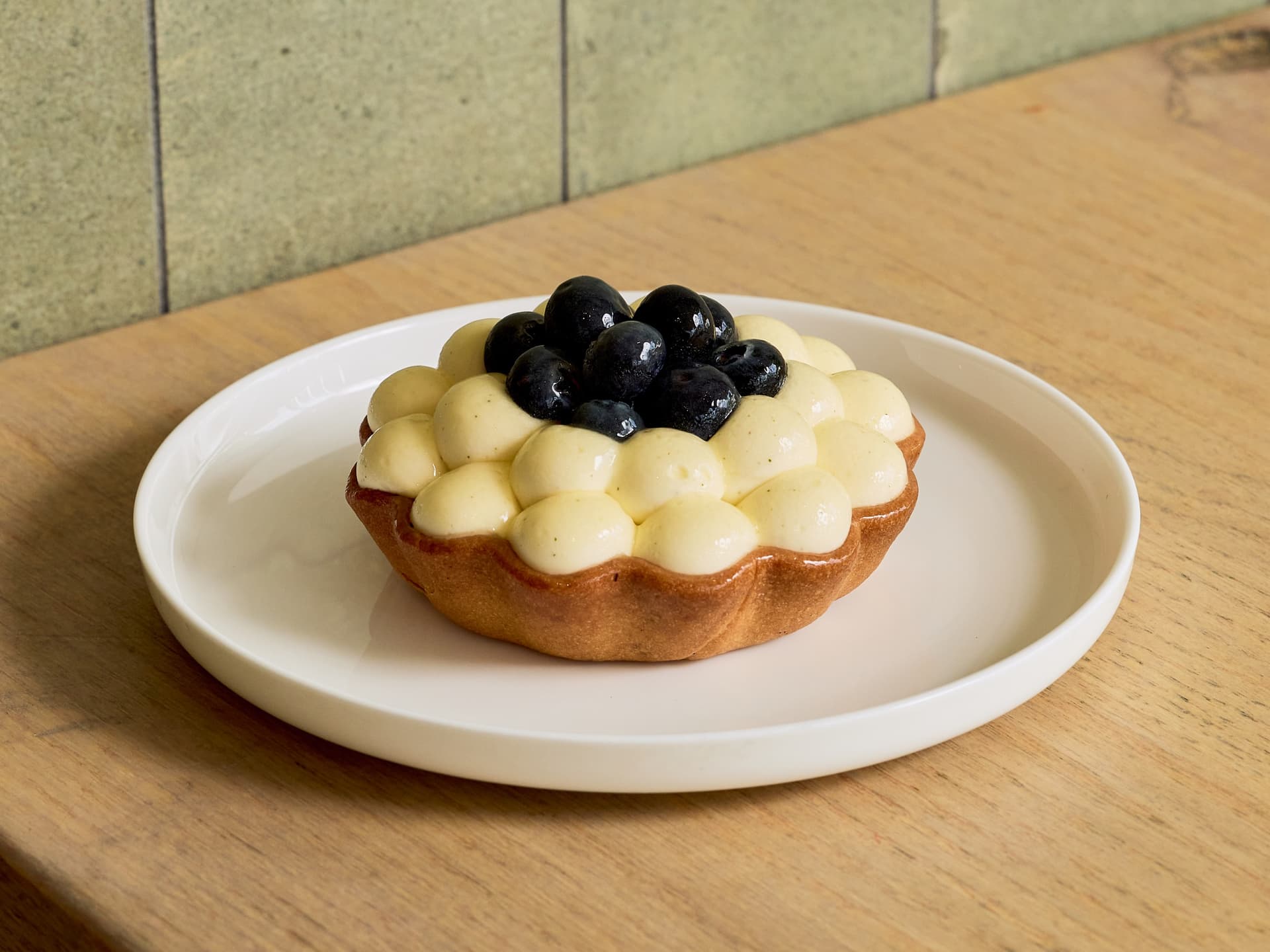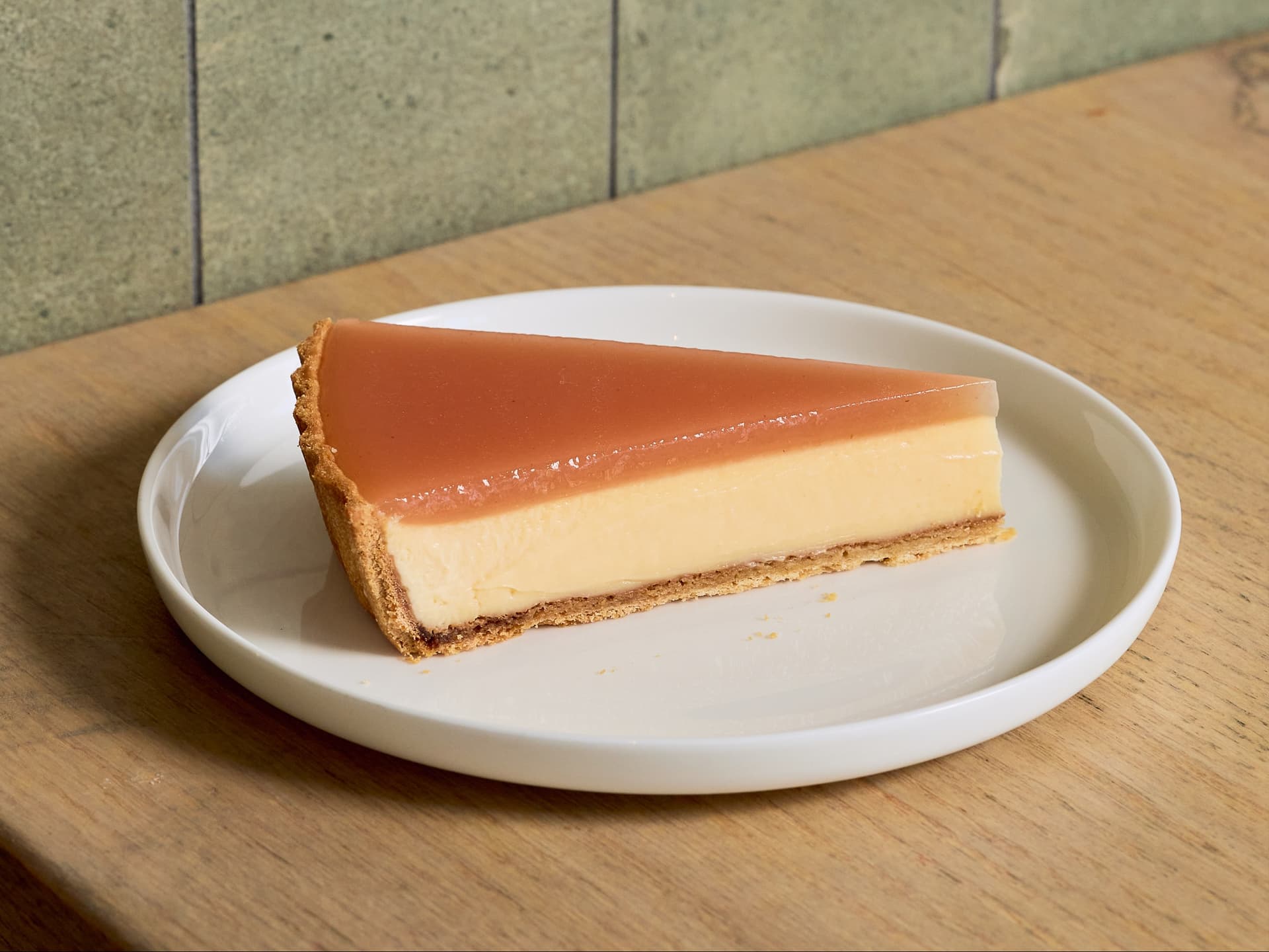 Umeshu (Japanese plum wine) flavoured custard topped with a white peach glaze, encased in our classic short crust pastry. *This tart contains alcohol.