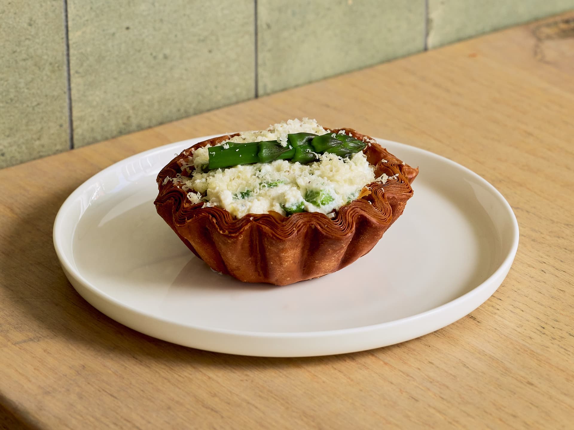 A leek, asparagus and almond cake mixed with ricotta and pickled lemon, topped with a seasoned ricotta Salata in our flaky brioche pastry.