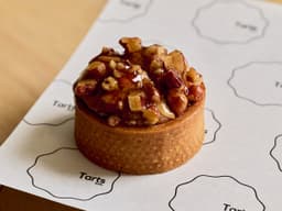 Pecan Cake [Flour (Wheat), Egg, Almond meal, Brown butter (Milk), Golden caster sugar, Brown sugar, Pecan puree, Salt, Baking powder], Shortcrust pastry [Flour (Wheat), Butter (Milk), Water, Salt], Maple Glaze [Pecans, Maple syrup, Brown sugar, Water, Pectin NH, Smoke powder, Citric acid], Butterscotch [White sugar, Cream (Milk), Butter (Milk), Salt]