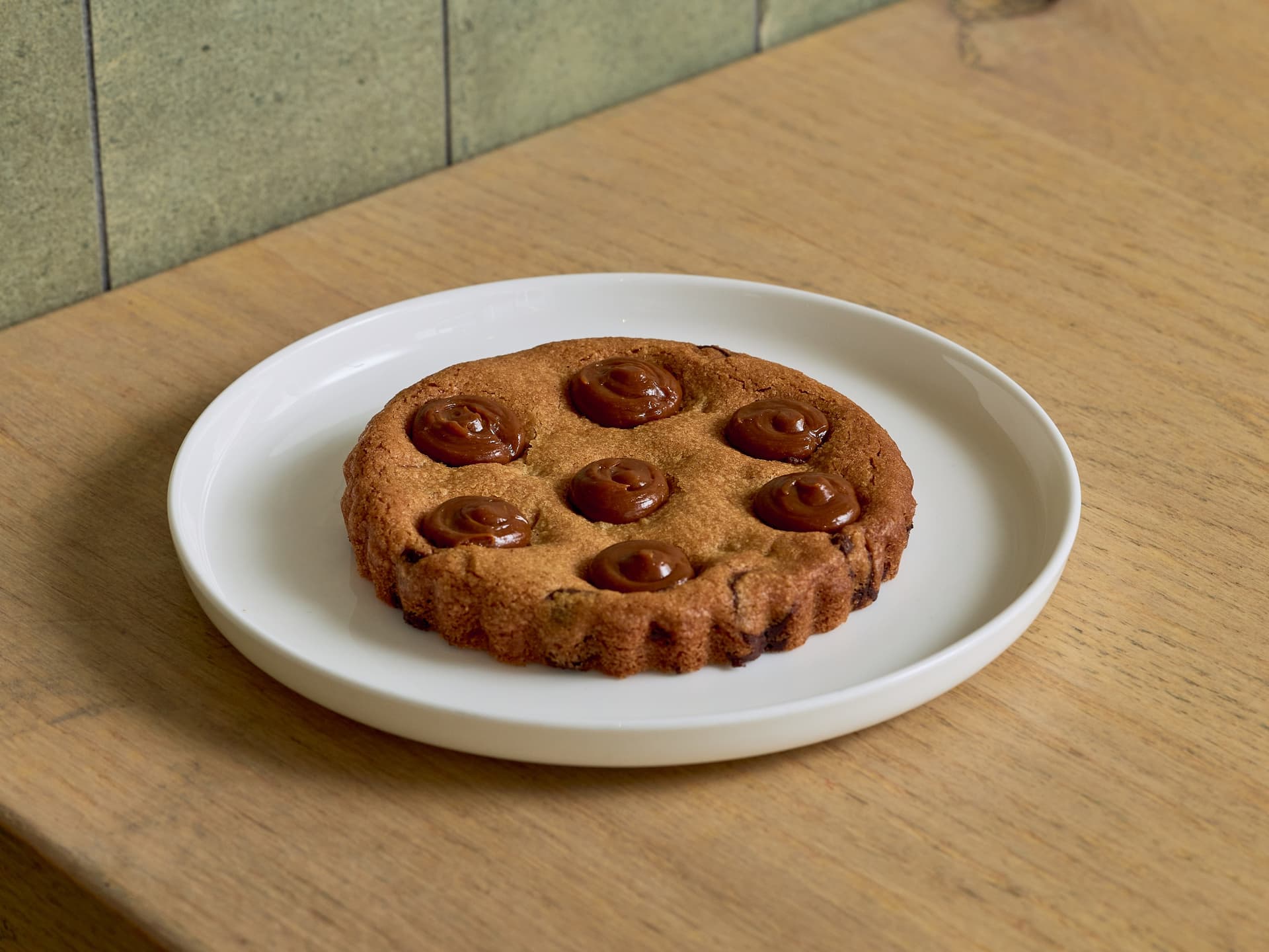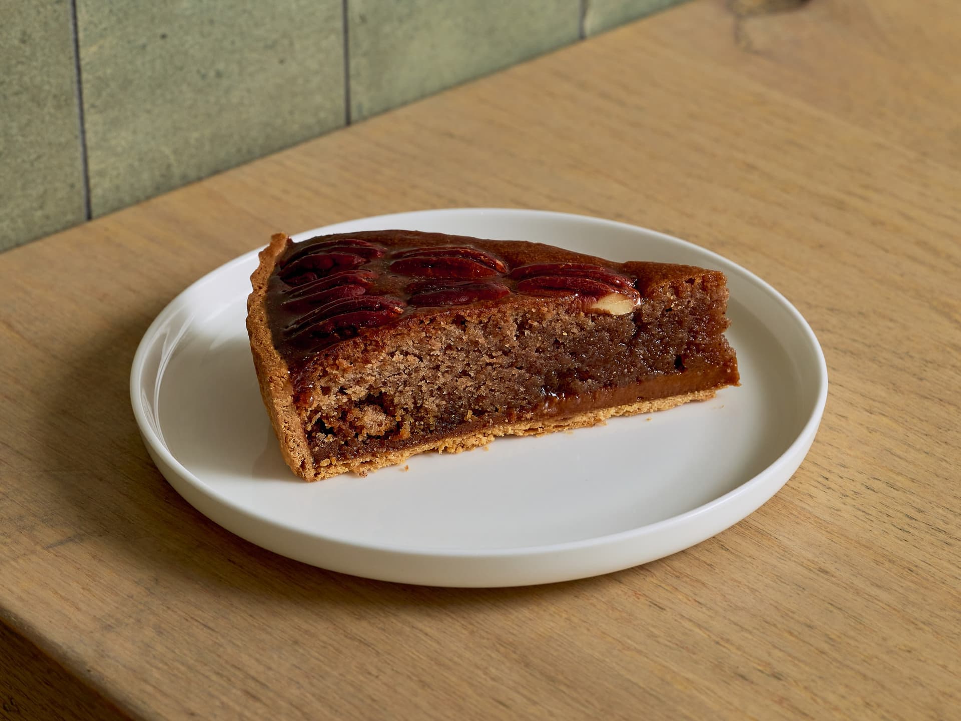 Our most iconic tart: A salted butterscotch caramel, layered with a moist pecan frangipane cake, dotted with roasted pecans and finished with a smoky maple syrup glaze, all encased in our classic shortcrust pastry shell.