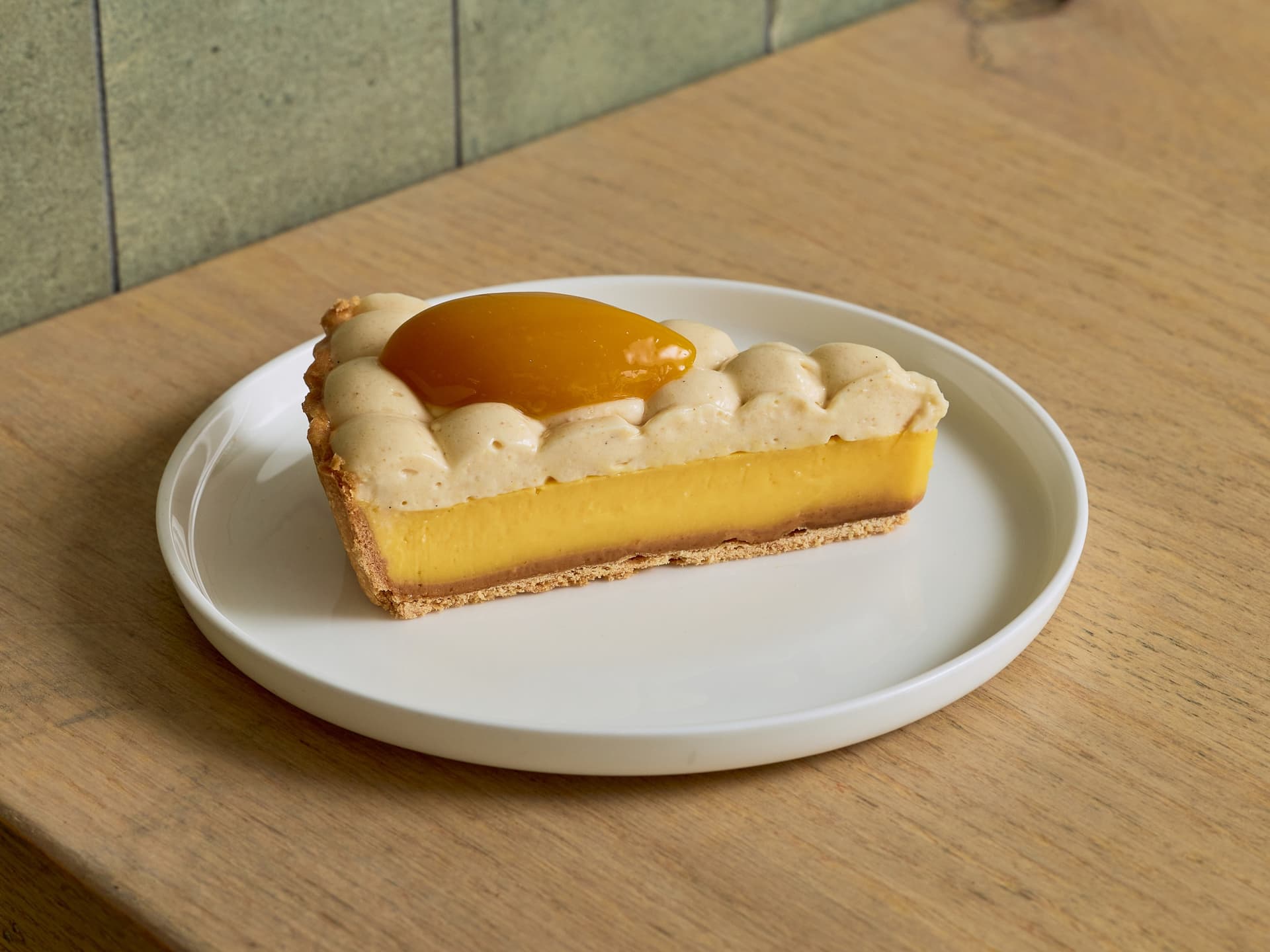 Mango custard baked on top of a macadamia caramel inside our classic shortcrust tart shell, finished with macadamia Chantilly and mango gel.