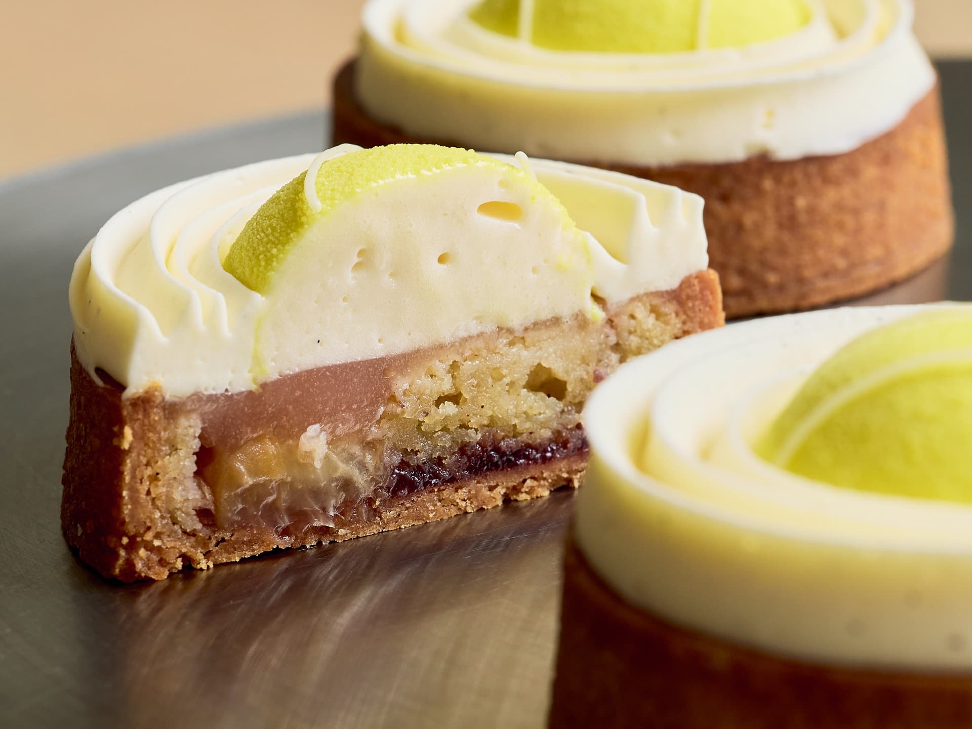 Raspberry and almond cake, peach mousse, peach gel and vanilla cream.
