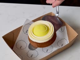 Peach Gel [White sugar, Xanthan gum (E415), Gellan F, Citric acid, White peach purée], Peach Cream [White sugar, Double cream (Milk), Halal Gelatine, White peach purée, Vanilla], Vanilla Chantilly [Brown sugar, Cream (Milk), Halal Gelatine, Vanilla, Coffee beans], Raspberry Jam [Raspberry, Caster sugar, Water, Pectin jaune, Citric acid], Almond Batter [White sugar, Orange oil, Egg, Brown butter (Milk), Almond meal, Salt, Baking powder]