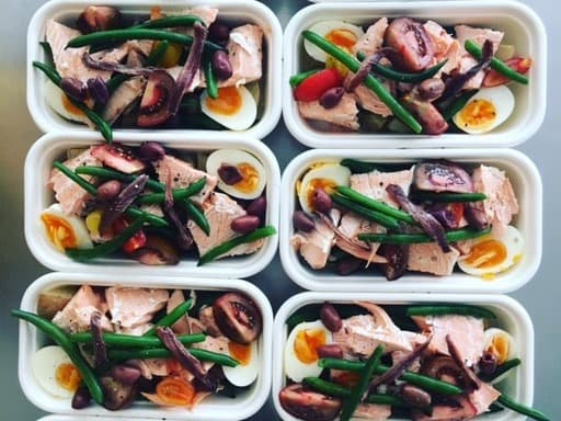 Take me back to the south of France... but with a twist. Fresh salmon with a traditional salad from Nice. Steamed green beans & potato with soft boiled egg, tomato, olives & anchovy fillets with a side of red wine & dijon vinaigrette.