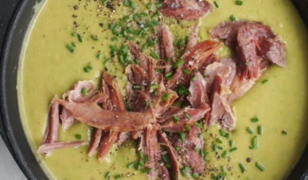 Smoked ham hocks from my butcher Trevor are simmered with vegetables to make a rich stock with dried & fresh peas & finished with a little cream. I blitz the soup for a smooth texture & add the shredded ham hock on top. Perfect on its own or with a bit of toast.