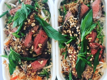 I start by marinating rump steak in white pepper, fish sauce, garlic & chilli before grilling then slice thinly & add rice noodles & crisp vegetables. Finished of with lots of fresh mint, coriander, crispy fried onions, peanuts & kick ass kaffir lime, chilli, coriander & fish sauce dressing (on the side.)