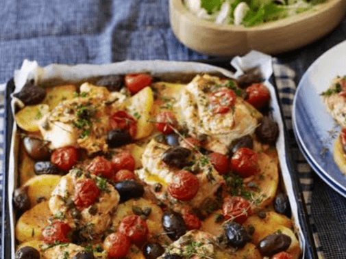Snapper fillets are marinated with garlic, chilli, olives, tomato, capers & parsley & layered with shaved potato & topped with red onions.