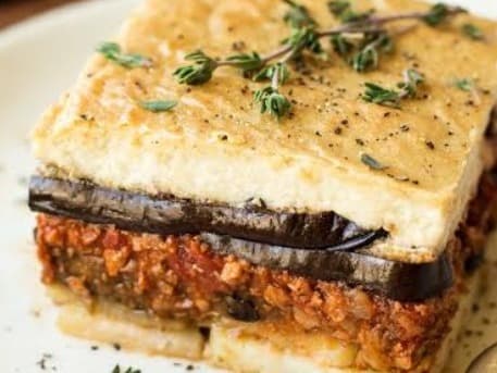 A Greek classic with a vegetarian twist. Brown lentils are slowly simmered with vegetables, red wine & spices then layered with cooked eggplant & potato & topped with bechamel sauce.