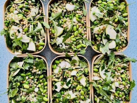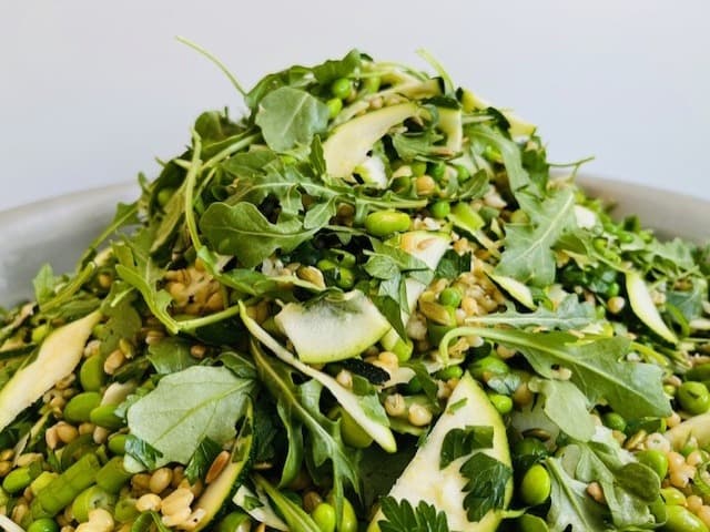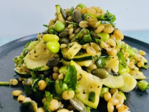 A celebration of greens with zucchini, green peas & edamame beans in a light fresh mint dressing. Freekeh (wheat grain) is a healthy & hearty grain & combined with fresh summer greens makes for a delicious lunch or light supper.