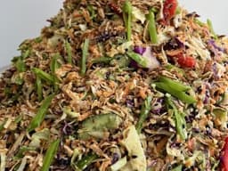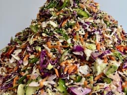 Fresh seasonal crisp vegetables are shredded to make this healthy light & colourful slaw. With a bright & zingy dressing on the side of fresh coriander, lime juice & chilli plus extra crispy onions, sesame seeds & peanuts.