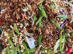 Carrot, cabbage, Lime juice, Capsicum, Sunflower oil, Snowpea, shallot fried, peanut roasted, sesame seed, Fish Sauce, coriander fresh, Garlic, Chilli, Sea salt, Pepper, Kaffir lime leaf