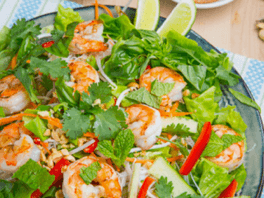 I use Australian Tiger prawns & add rice noodles & crisp vegetables. Finished of with lots of fresh mint, coriander, crispy fried onions, peanuts & kick ass kaffir lime, chilli, coriander & fish sauce dressing (on the side.)