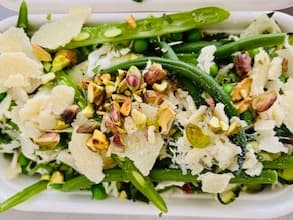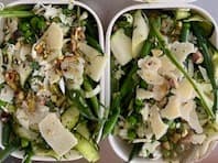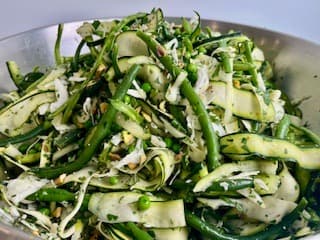 This is a fresh & textural salad of zucchini , beans, summer greens with pistachio nuts & shaved parmesan. With a bright & zippy preserved lemon & honey dressing on the side.