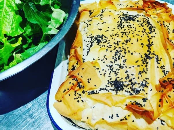 My take on Spanakopita (a Greek Silver beet & feta filo pastry pie. ) Onions & garlic are sauteed with fresh silver beet & spinach then folded into creamy ricotta & Greek feta cheese. Laced with fresh dill, toasted pine nuts & nutmeg before being tucked into filo pastry & finished with olive oil & sesame seeds. The result is the lightest most crisp pie ever. Perfect on its own or with a side salad.