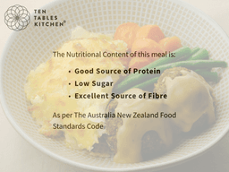 Beef Rissoles [Lean Beef Mince, Onion, Cracked wheat, Water, Worcestershire sauce (GF), Tomato sauce, Garlic, Salt, Oregano, Pepper], Potato Bake [Potatoes, Water, Skim milk, Flour (GF), Mozzarella (Milk), Starch, Parmesan (Milk), Salt and pepper mix], Diance Sauce [Water, Cream (Milk), Bechamel sauce, Tapioca starch, Salt, Worcestershire sauce (GF), Canola oil, Soy powder, Beef stock powder (GF)], Beans, Roasted rings carrots