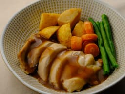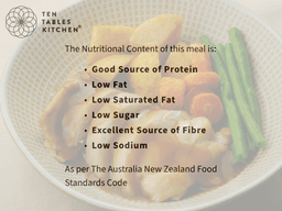 Chicken thigh skin off, Roast potato, Roasted rings carrots, Beans, Gravy [Water, Reserved stock (Lamb, Beef, or Chicken), Gravy powder (Milk, Sulphites), Starch], Canola oil, Salt, Paprika